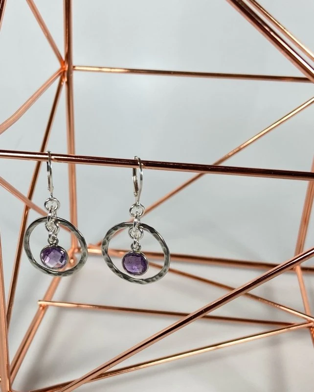 Handmade with care, these earrings are adorned with Amethyst crystals & hand hammered sterling silver. One of a kind!