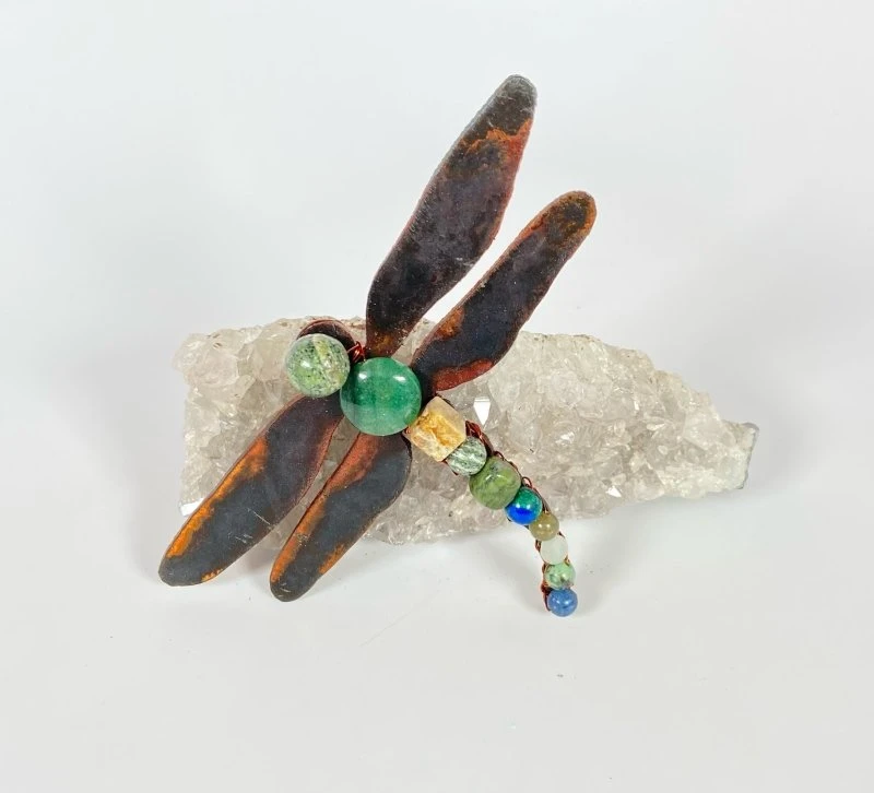 Dragonflies are proudly made from upcycled metals in Canada and adorned with semi precious stones.