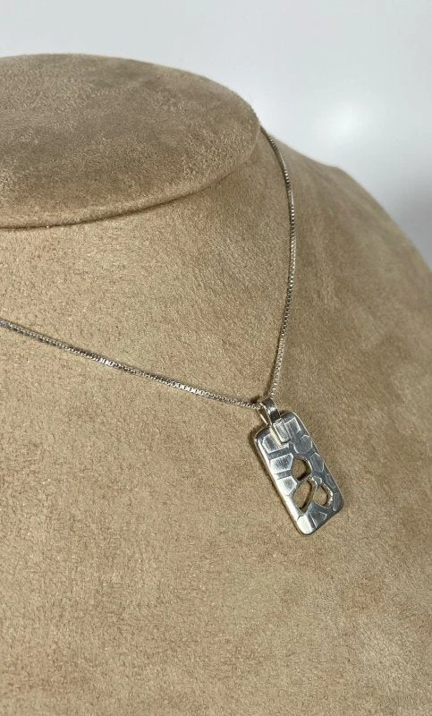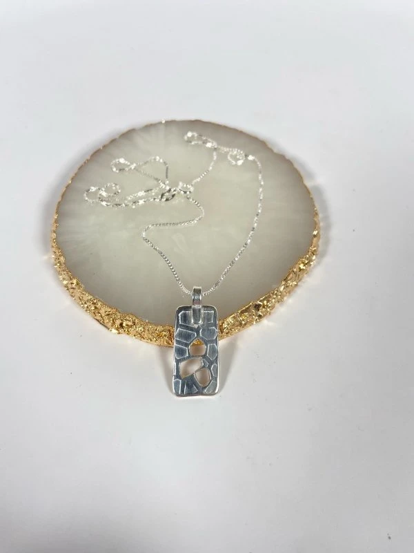 This beautiful and unique necklace is hand crafted with a hand rolled tortoise imprint, and hand cut. A labor of love! This mini necklace is under 1″ and has a 16″ solid sterling silver box chain. On of a kind!