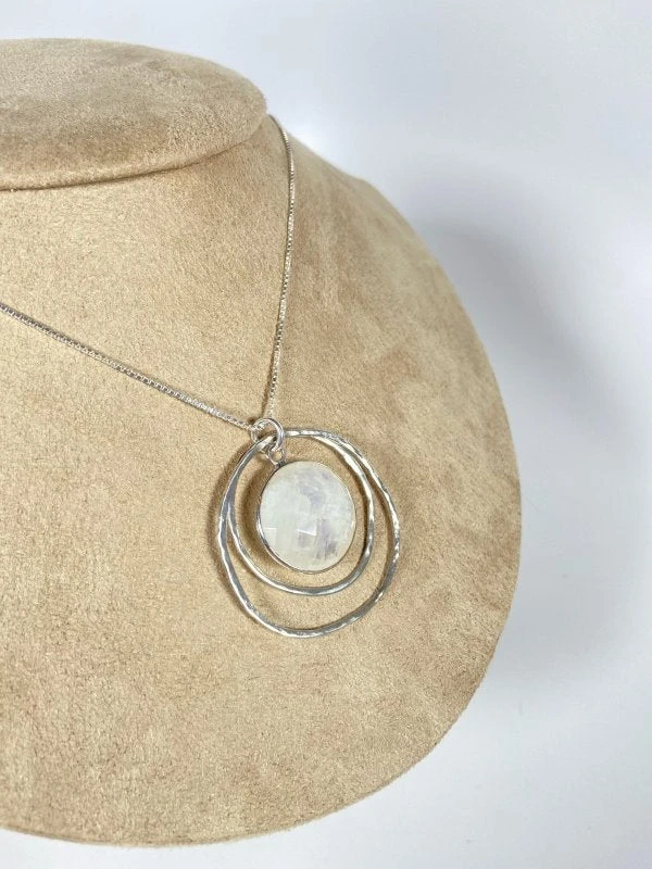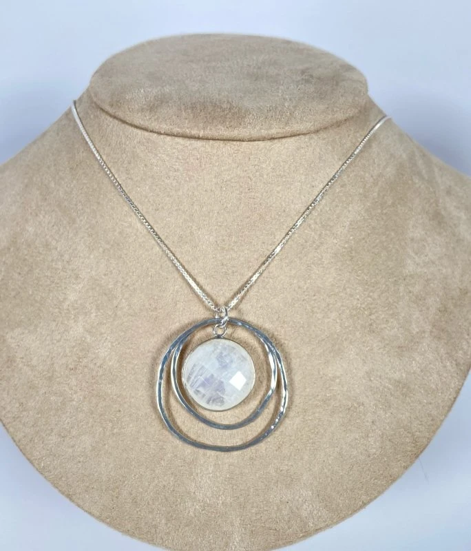 Handcrafted in Alberta and one of a kind, 2 round hand hammered Sterling Silver rings enclose a nice Moonstone crystal!