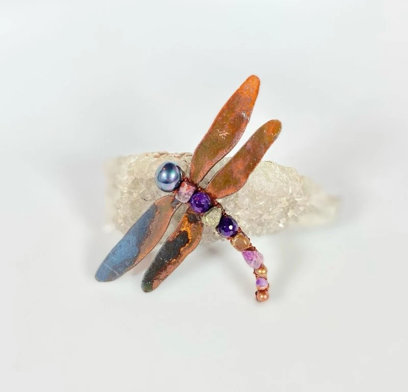 Dragonflies are proudly made from upcycled metals in Canada and adorned with semi precious stones, pearls, amethyst and Swarovski crystals