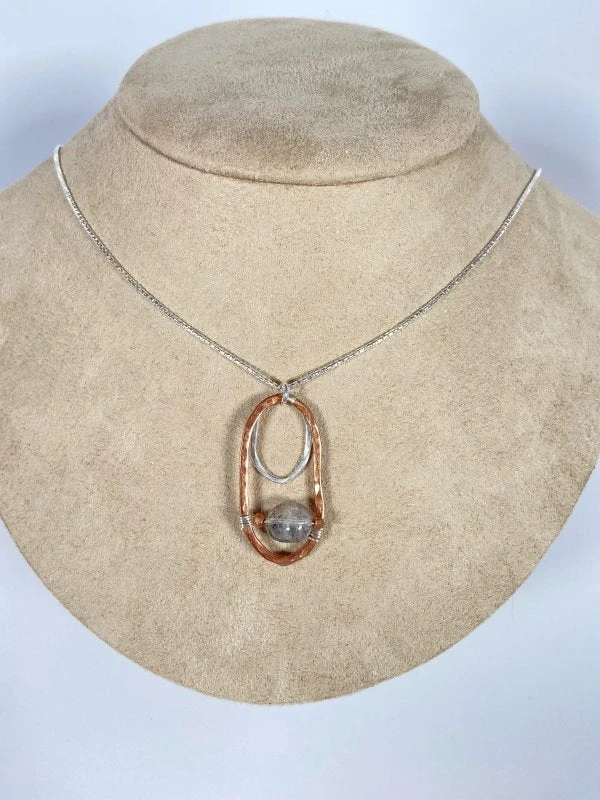 Handcrafted in Alberta and one of a kind, oval hand hammered Sterling Silver & Copper with an Quartz and Pyrite Crystal. Mixed metals rock!