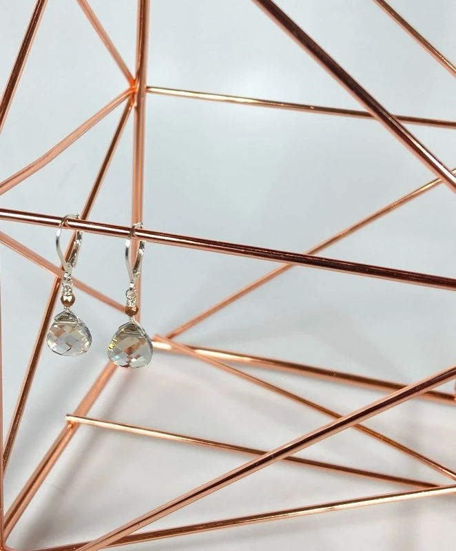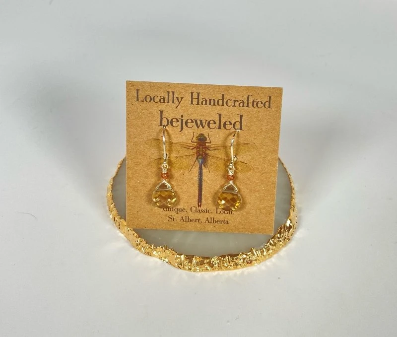 Handmade with care, these lovely pear shaped Swarovski crystal earrings paired with Pyrite are easy to wear! The crystals pick up the colors around them – the color on the card is more ‘tan’, a truer version of the color is shown with the earring hanging.