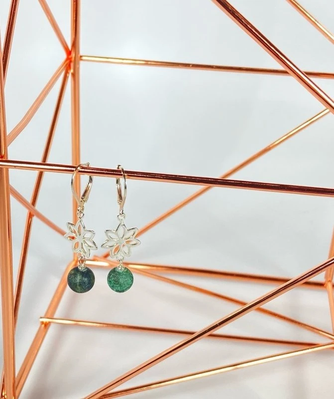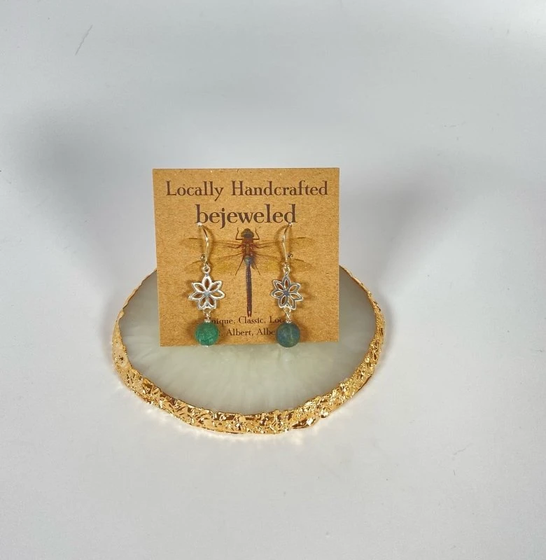 Handmade with care, the turquoise is a lovely matte stone and the sterling silver flower shines! One of a kind.