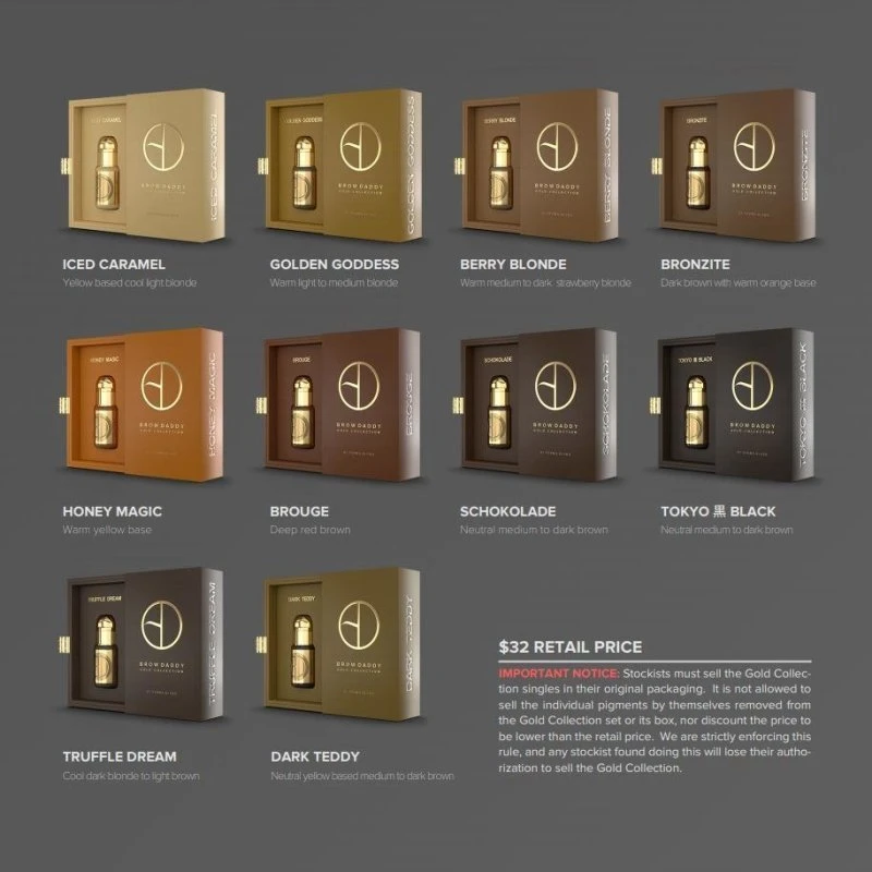The Gold Collection by Brow Daddy x Perma Blend provides a great variety of ten colors. Some of them are pre-modified and some are neutral or cool based. This allows the artist to serve any client with any technique of their choice. It is formulated with the highest pigment load to ensure the absolute best healed results with 80-90% retention and heals true to color.