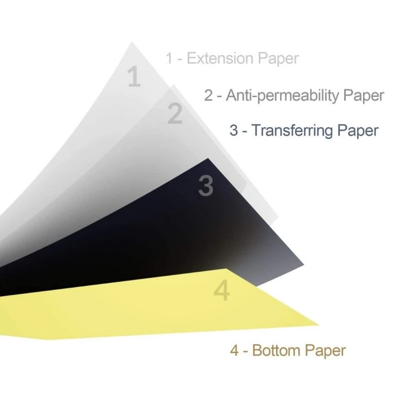 - 4 LAYERS TRANSFER PAPER: The thermal stencil transfer paper is divided into four layers. Layer 1 white master sheet; Layer 2 Semi-transparent, used to prevent scratches, protective tissue to be removed before use; Layer 3 transferring paper; Layer 4 yellow bottom paper.